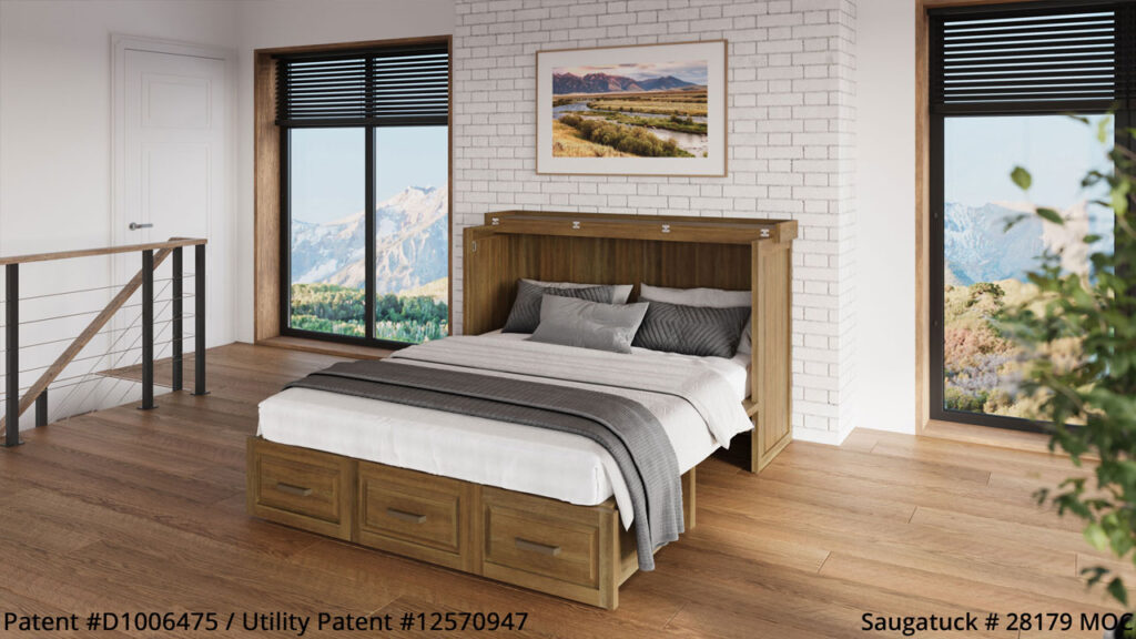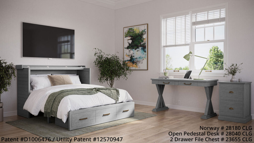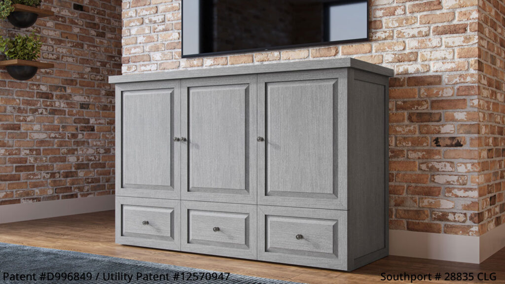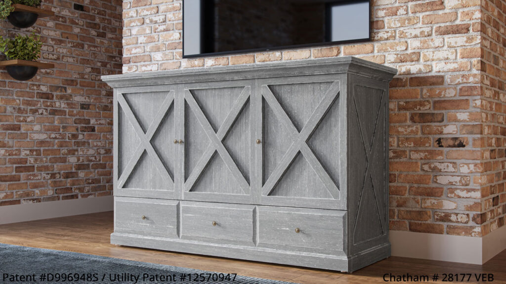 Guest Chest™ Murphy Beds are perfectly sized to be used as a TV credenza in the family room. Ideal for use in a home office or simply as a sideboard/sleep cabinet in a basement or living room. Guest Chest™ Murphy Beds come fully assembled and ready to go! All Guest Chests™ include a high quality 6″ tri-fold memory foam mattress with washable cotton weave cover and come in a variety of stained and hand distressed finishes.Â